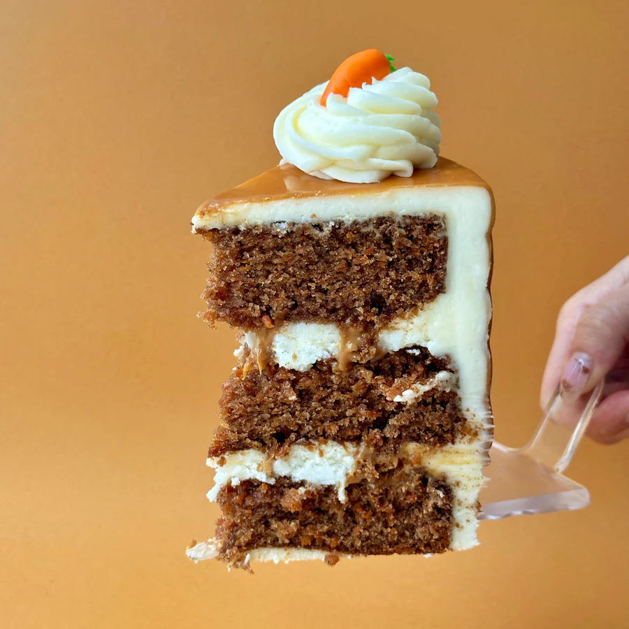 3 layers of Vanilla cake with salted caramel and cream cheese icing between the layers. Cake covered in cream cheese icing, topped with salted caramel drip, cream cheese icing swirls and mini fondant carrots. Message on cake included! Input message for your cake @ cart page in the “Special instructions for seller” box.